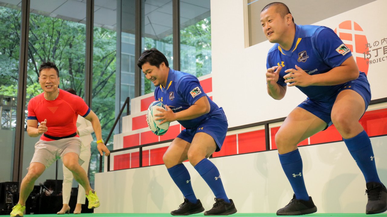 丸の内15丁目 続いて 現役ラグビー選手が登場 ラグビー選手は首が太いことが特徴で 首を鍛える筋トレもしているのだそう みんなで 谷本先生お勧めの 中腰ステップの体操にトライ ラガーマンにとってもキツい内容に あと